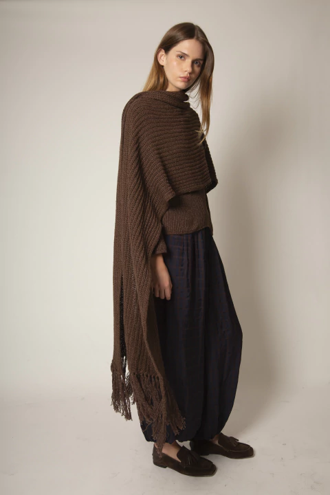 La manta Monopoli esta tejido en maquina artesanal gruesa en perle, en una combinacion de algodon y angora. Material ideal para media estacion.